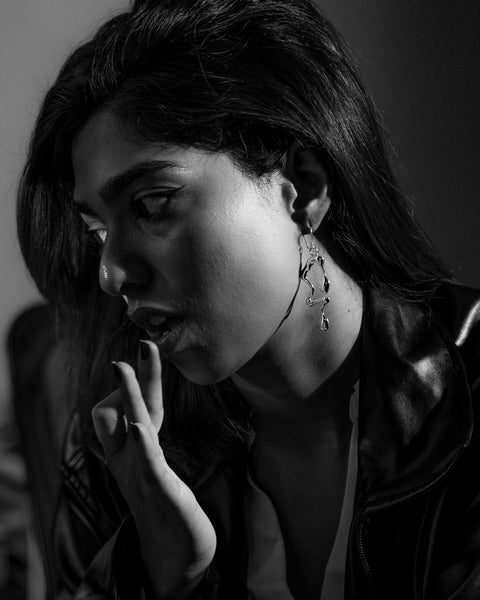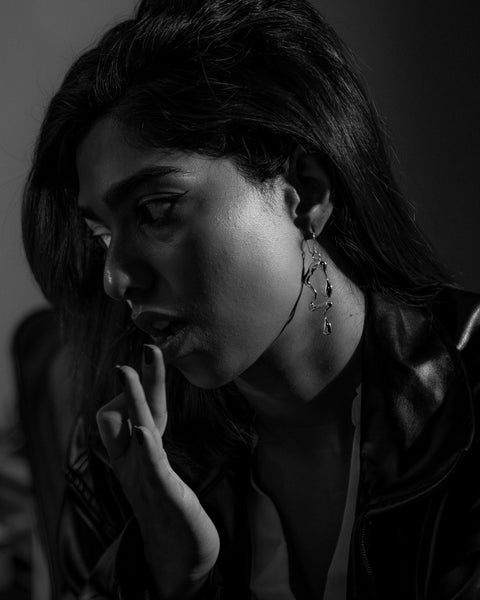 Forged from the rhythm of a summer storm, the 'Fragment of Drip' collection embodies the essence of rain. Each piece—a sleek earpiece, necklace, and ring—captures the bold, fluid lines of raindrops mid-fall. With every glistening curve, this set drips attitude, turning heads and making statements. Adorn yourself with the 'Fragment of Drip' and let every step feel like you're walking in the heart of a storm, dripping confidence.